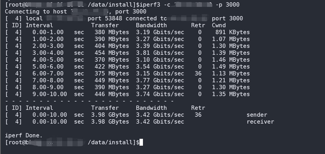 上面的返回结论是: 共传输了 3.98 GB 的数据,发送方带宽是 3.42 Gbits/s,接收方带宽是 3.42 Gbits/s。换算成传输速率就是:(3.42*1024/8) MB/s ,约为 400 MB/s。