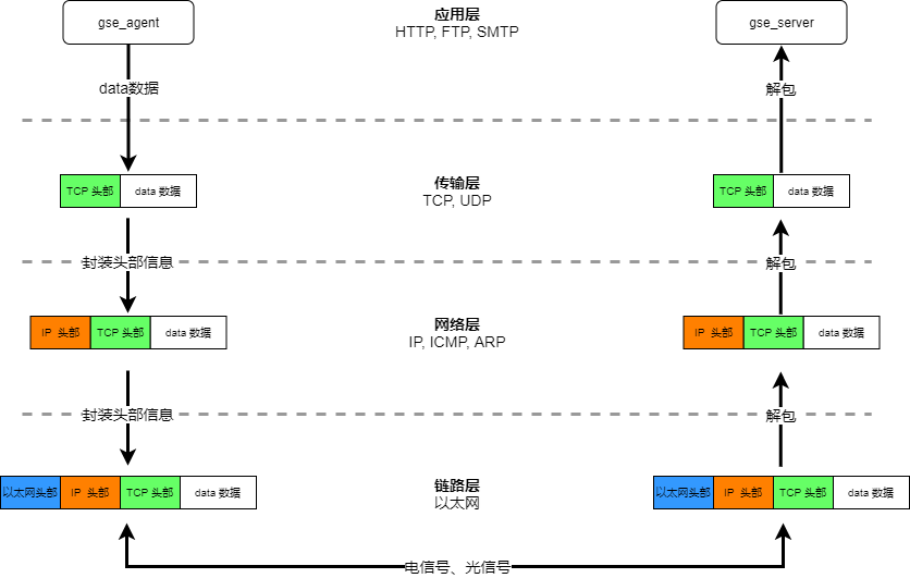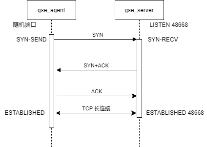 - gse_agent 收到 SYN+ACK 信号后,立即回复 ACK 的应答到 gse_server。当 gse_server 收到应答后,即建立起连接,