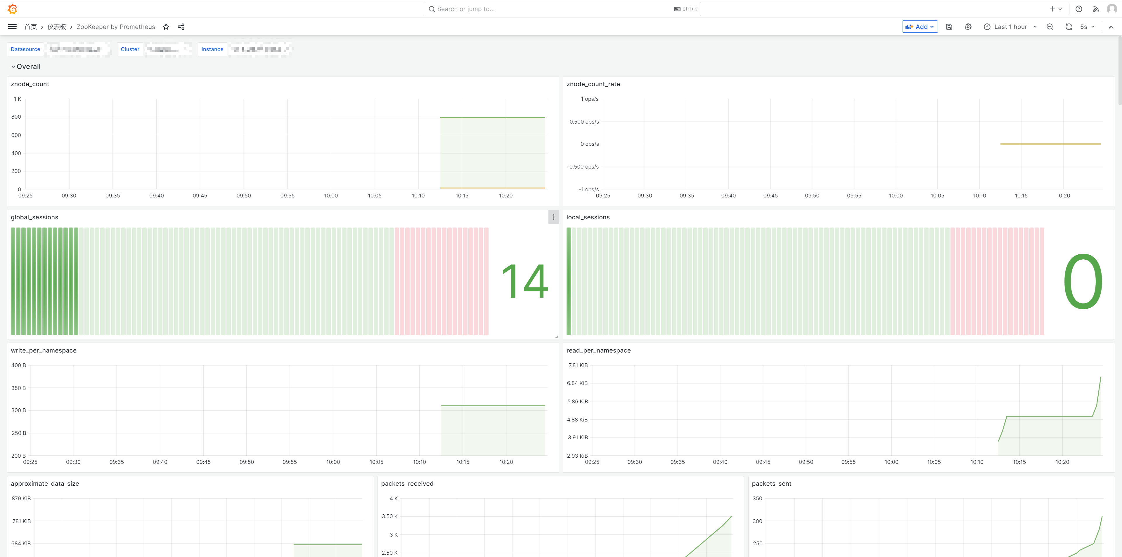 同样,Zookeeper 也提供了对应的 Grafana 视图 ZooKeeper by Prometheus,导入后即可看到下以 Dashboard: